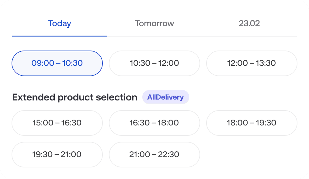 Since some users choose a later delivery time slot directly from the homepage, we clearly communicate that this option unlocks access to the extended assortment.
