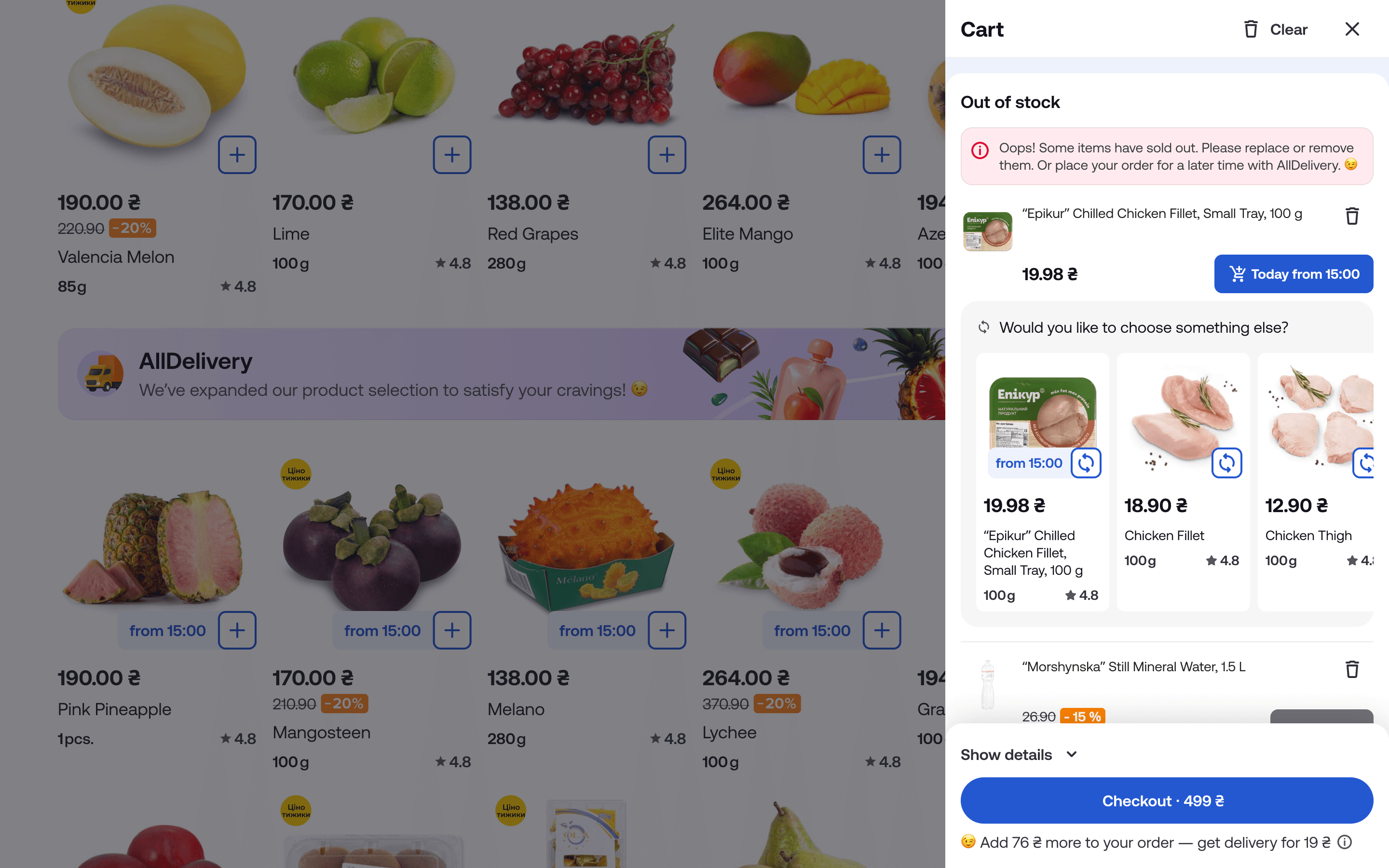 We redesigned the “Out of Stock” scenario across all entry points. If a product is unavailable for immediate delivery, we offer an alternative with dark hub delivery directly in the cart.